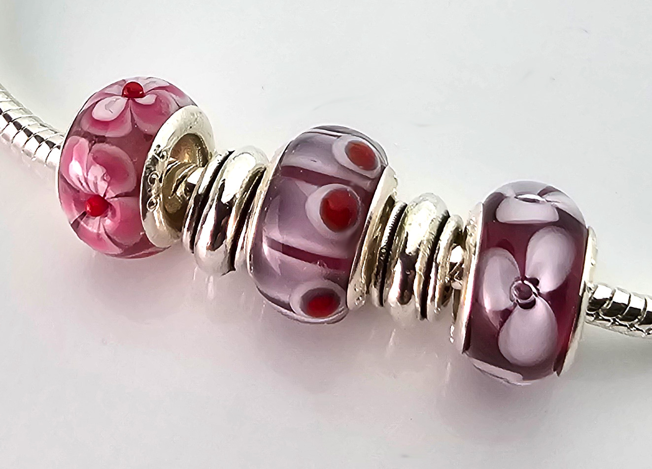 Modulperlen mit max. 14 mm Außendurchmesser im 3er Set aus Muranoglas in Bordeauxrot und Rosè mit Sterlingsilberhülse, 5mm-Lochdurchmesser, passend für alle gängigen Ketten und Armbänder bekannter Markenhersteller.
