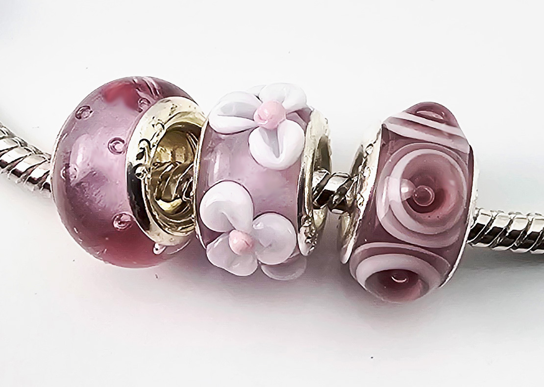 Modulperlen mit max. 14 mm Außendurchmesser im 3er Set aus Muranoglas in Pinkrosè mit Sterlingsilberhülse, 5mm-Lochdurchmesser, passend für alle gängigen Ketten und Armbänder bekannter Markenhersteller.