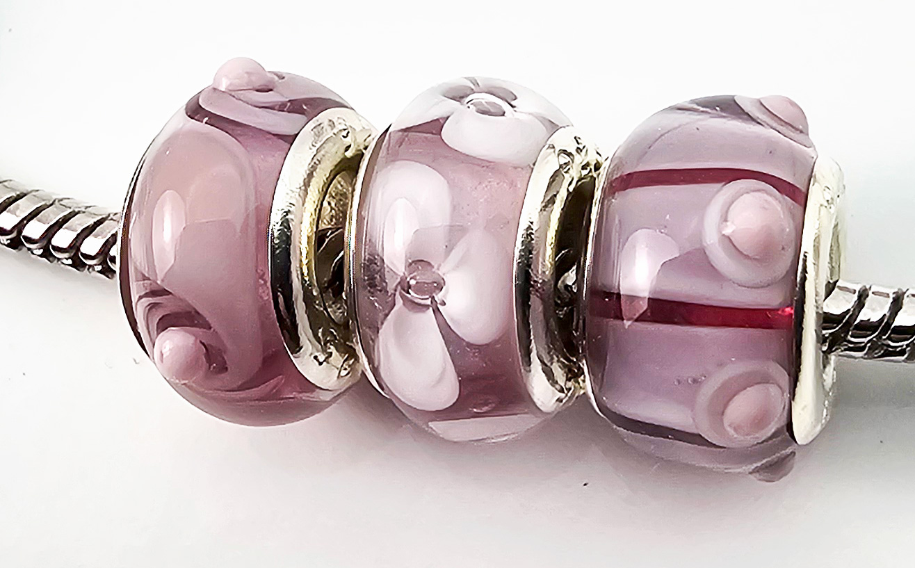 Modulperlen mit max. 14 mm Außendurchmesser im 3er Set aus Muranoglas in Pinkrosè mit Sterlingsilberhülse, 5mm-Lochdurchmesser, passend für alle gängigen Ketten und Armbänder bekannter Markenhersteller.