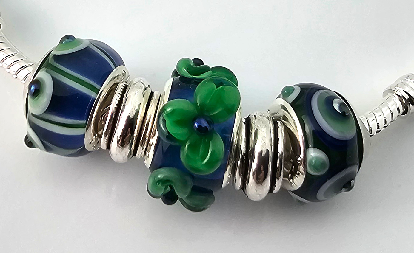 Modulperlen mit max. 14 mm Außendurchmesser im 3er Set aus Muranoglas in Smaragdgrün und Saphirblau mit Sterlingsilberhülse, 5mm-Lochdurchmesser, passend für alle gängigen Ketten und Armbänder bekannter Markenhersteller.