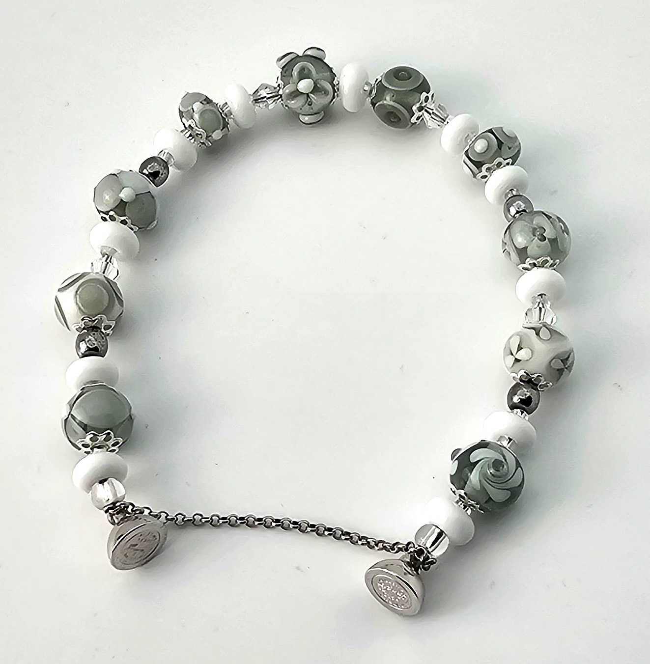 Aufwändig gearbeitetes Armband in weiss-grau gehaltenen Farben. Alle Perlen sind aus Muranoglas handgewickelt. Jede einzelne Perle für sich ist ein kleines Kunstwerk.