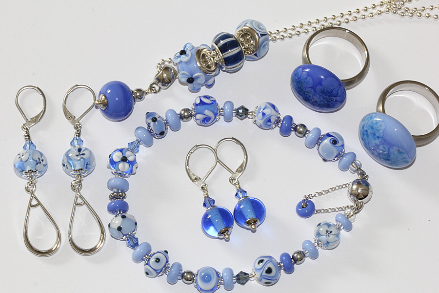 Collier Saphirblaue Vielfalt, 50 cm, Handgewickelte Muranoglasperlen mit 8 - 10 mm Durchmesser. Desweiteren habe ich farblich passende Swarowski-Kristalle, rhodinierte Perlkappen und Silbereinzugsperlen als Zwischenglieder verarbeitet.
