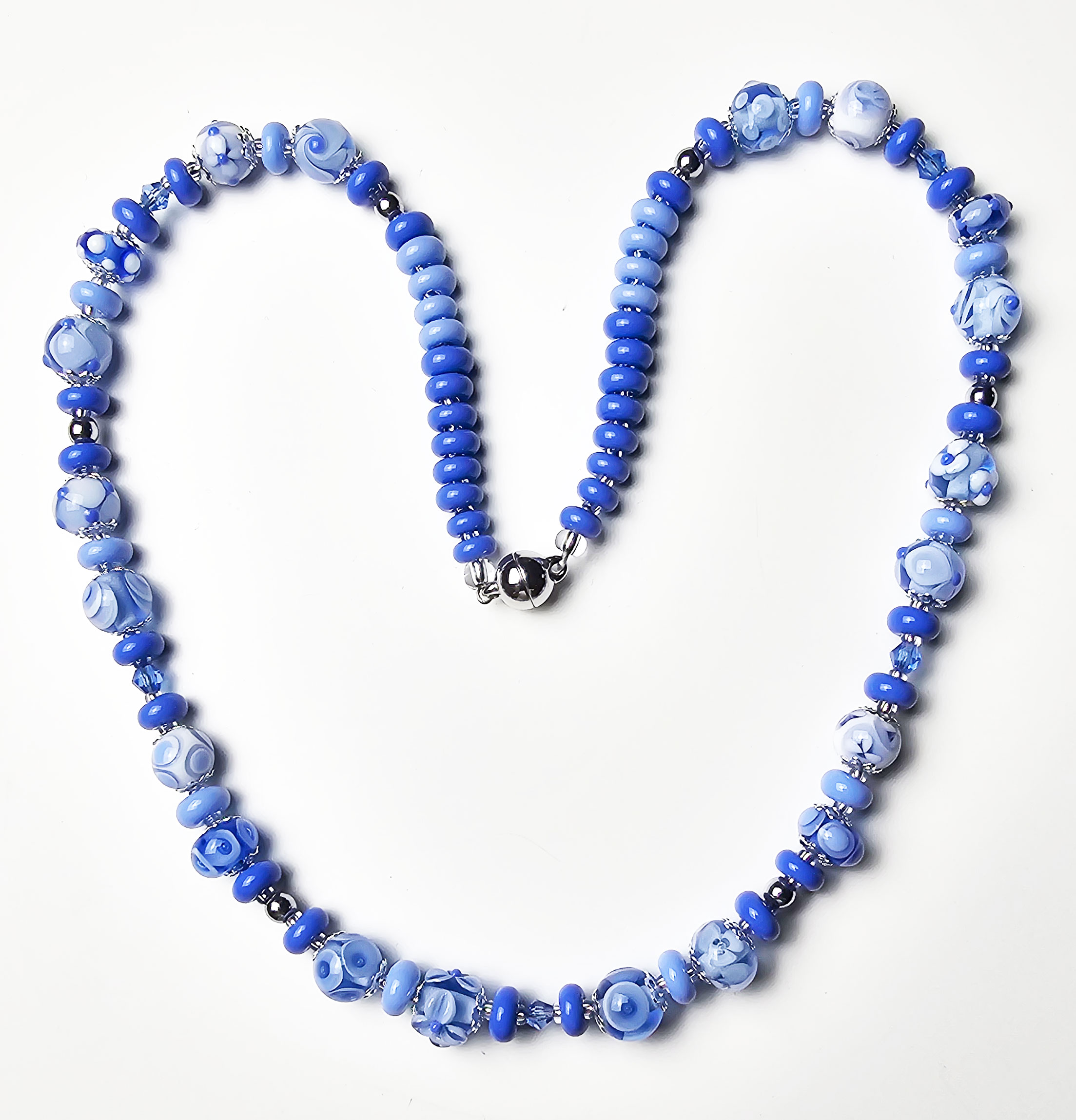Collier Saphirblaue Vielfalt, 50 cm, Handgewickelte Muranoglasperlen mit 8 - 10 mm Durchmesser. Desweiteren habe ich farblich passende Swarowski-Kristalle, rhodinierte Perlkappen und Silbereinzugsperlen als Zwischenglieder verarbeitet.
