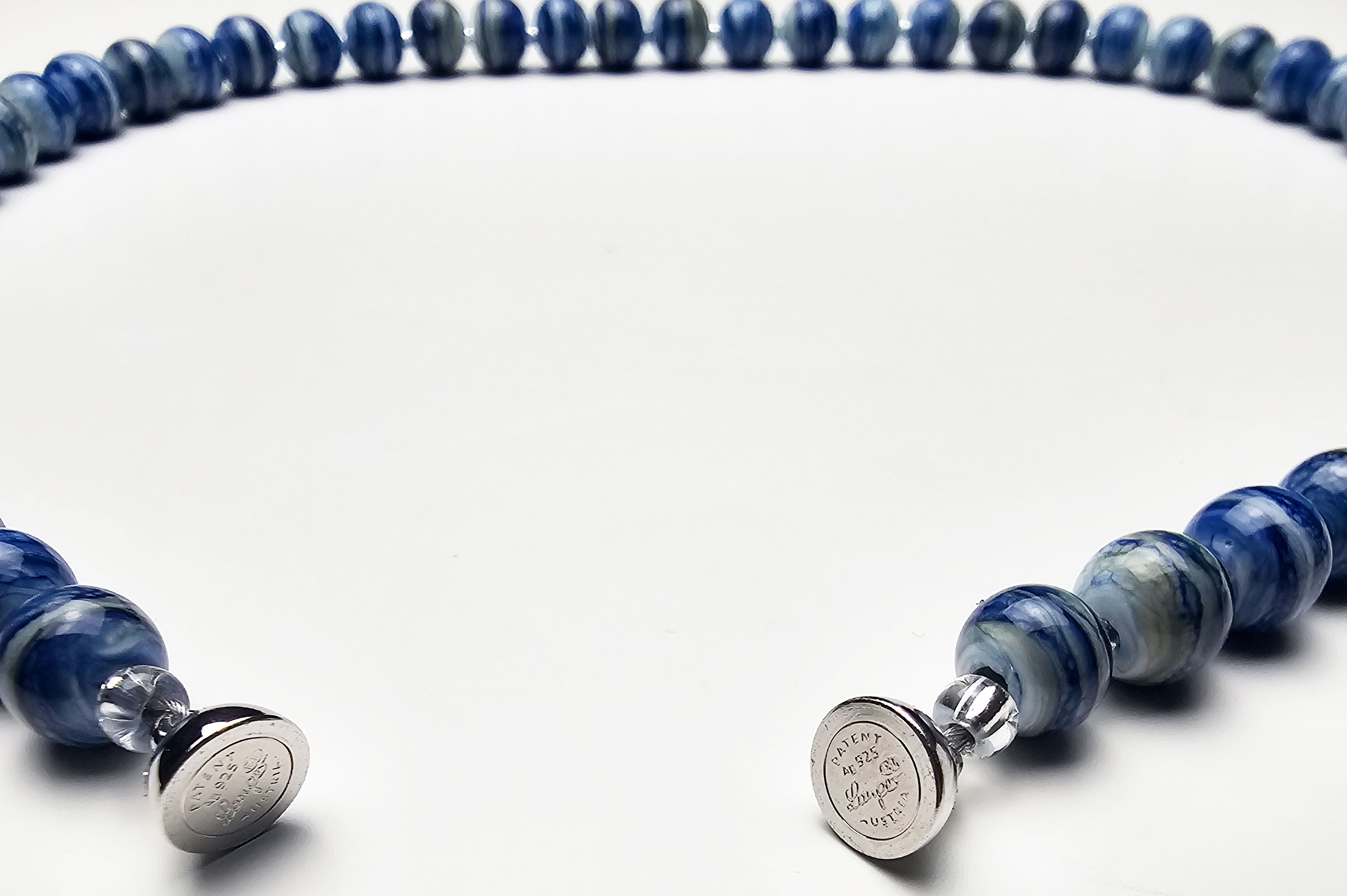 Besondere Aufmerksamkeit verdient der patentierte Magnetverschluss von der Fa. Langer. Die Langer-Magnetschließe, hier mit rhodiniertem Sterlingsilber, unterscheidet sich von anderen Magnetschließen wesentlich. Bei Langer-Magnetschließen mit Qualitätssiegel an der Innenseite sind die Magneten vollkommen mit Edelmetall verschlossen und daduch nicht sichtbar. Also kein offener, verklebter oder laserpunktierter Magnet. In diesen Verschluss kann keine Flüssigkeit oder Schweiß etc. endringen. Made in Austria. Fa. Langer besitzt über 15 Jahre Produktionserfahrung sowie die dazugehörenden Patente.