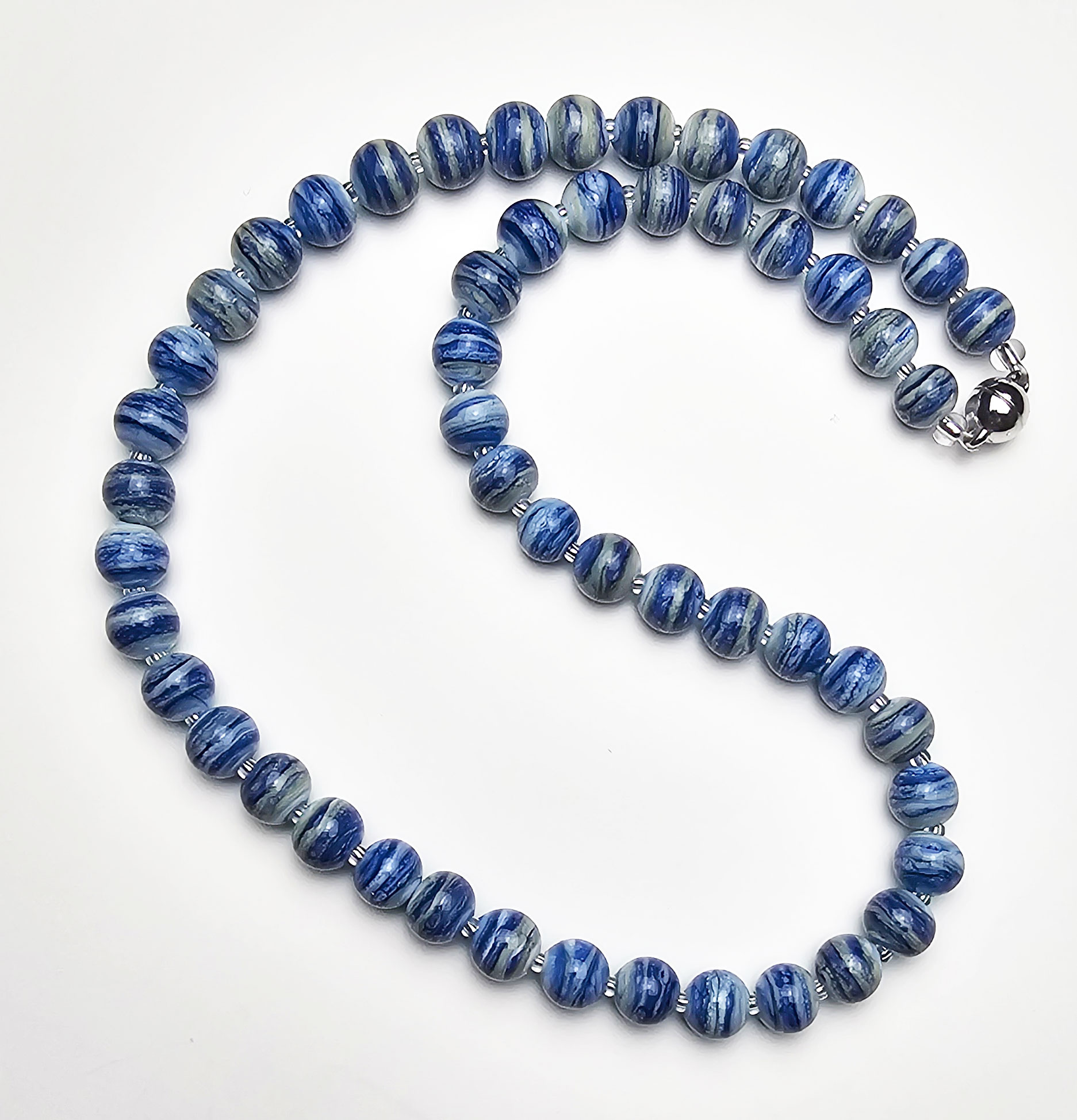 Kette "Lapiz And Ivory". Länge 48 cm. Handgewickelte Perlen aus zweifarbigem Muranoglas in Elefenbein- und Lapiz-Farbtönen. Ergänzt mit winzigen Silbereinzugsperlen.