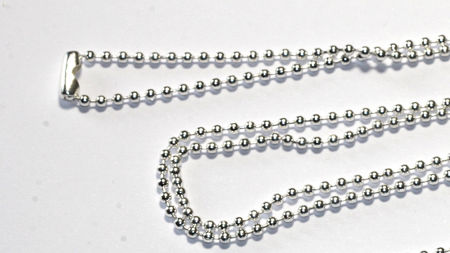 Zarte Kette mit Kugelgliedern, 2,2 mm. Karabinerverschluss und Kette sind versilbert.