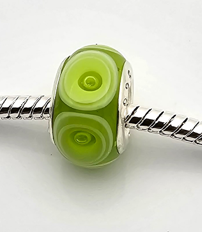 Modulperle mit Akzentfarbe Grasgrün. Alle Modulperlen sind mit Sterlingsilberhülsen ausgestattet. Der Außendurchmesser ist ca. 14 mm. Die Perle ist 9mm breit. Der Lochdurchmesser beträgt immer 5 mm. Passend für alle gängigen Ketten und Armbänder bekannter Markenhersteller.
