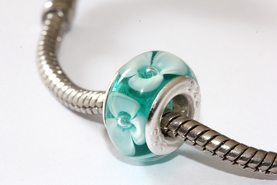 Modulperle mit Akzentfarbe Meergrün. Alle unsere Modulperlen sind mit Sterlingsilberhülsen ausgestattet. Der Außendurchmesser ist ca. 13 mm. Der Lochdurchmesser beträgt immer 5 mm. Passend für alle gängigen Ketten und Armbänder bekannter Markenhersteller. Alle Glasperlen werden am Zweigas-Brenner aus Morettiglas (Muranoglas) handgefertigt. Die Perlen werden im digital gesteuerten Ofen spannungsfrei getempert. Für lange Lebensdauer robuste Qualität. Jedes Teil ist ein Unikat.
