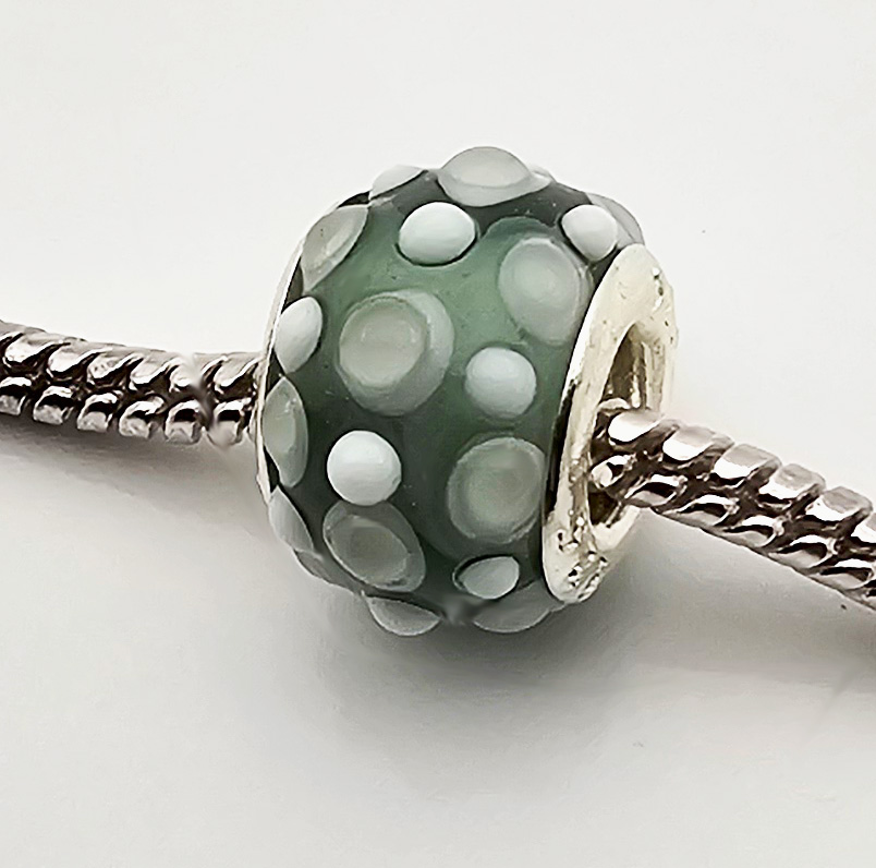 Modulperle mir Akzentfarben Silbergrau und Weiß. Alle unsere Modulperlen sind mit Sterlingsilberhülsen ausgestattet. Die Perle ist 9 mm breit. Der Außendurchmesser ist ca. 14 mm. Der Lochdurchmesser beträgt immer 5 mm. Passend für alle gängigen Ketten und Armbänder bekannter Markenhersteller.