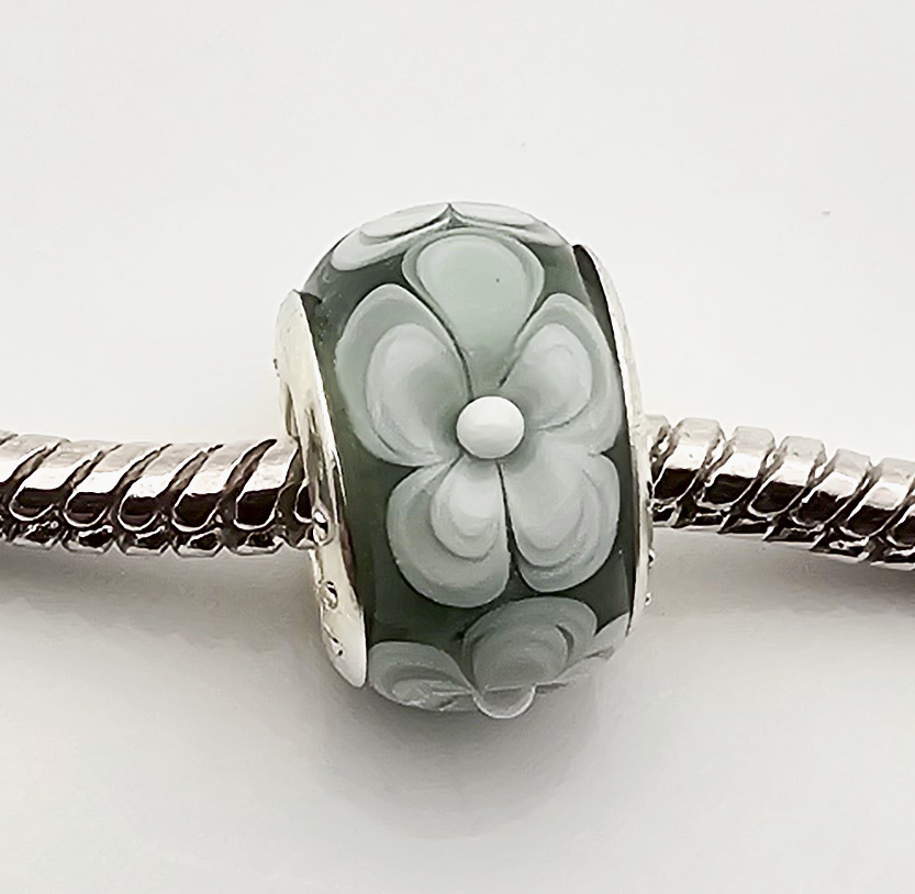 Modulperle mir Akzentfarben Silbergrau und Weiß mit "schwimmenden" Blüten und weißen Tupfen. Alle unsere Modulperlen sind mit Sterlingsilberhülsen ausgestattet. Die Perle ist 8 mm breit. Der Außendurchmesser ist ca. 13 mm. Der Lochdurchmesser beträgt immer 5 mm. Passend für alle gängigen Ketten und Armbänder bekannter Markenhersteller.