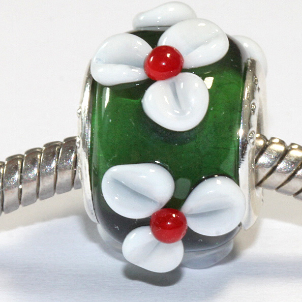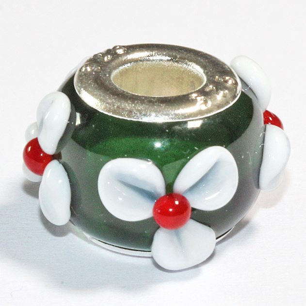 Modulperle in tannengrün mit weiß und rot. Alle Modulperlen sind mit Sterlingsilberhülsen ausgestattet. Der Außendurchmesser ist ca. 14 mm. Der Lochdurchmesser beträgt immer 5 mm.. Passend für alle gängigen Ketten und Armbänder bekannter Markenhersteller. Alle Glasperlen werden am Zweigas-Brenner aus Morettiglas (Muranoglas) handgefertigt. Die Perlen werden im digital gesteuerten Ofen spannungsfrei getempert. Für lange Lebensdauer robuste Qualität. Jedes Teil ist ein Unikat.