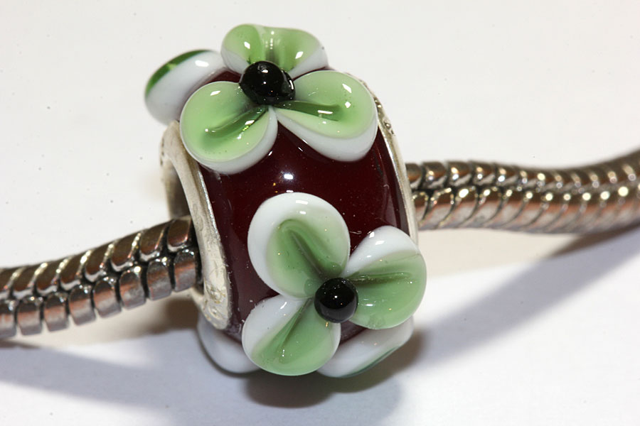 Modulperle in Rot und Tannengrün. Aufgesetzte Blüten. Alle unsere Modulperlen sind mit Sterlingsilberhülsen ausgestattet. Der Außendurchmesser ist ca. 14 mm. Der Lochdurchmesser beträgt immer 5 mm. Passend für alle gängigen Ketten und Armbänder bekannter Markenhersteller. Alle Glasperlen werden am Zweigas-Brenner aus Morettiglas (Muranoglas) handgefertigt. Die Perlen werden im digital gesteuerten Ofen spannungsfrei getempert. Für lange Lebensdauer robuste Qualität. Jedes Teil ist ein Unikat.