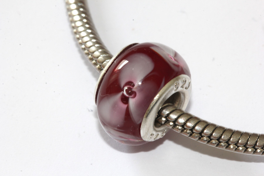 Modulperle in Bordeaux-Rot. "Schwimmende" Blüten. Alle unsere Modulperlen sind mit Sterlingsilberhülsen ausgestattet. Der Außendurchmesser ist ca. 14 mm. Der Lochdurchmesser beträgt immer 5 mm. Passend für alle gängigen Ketten und Armbänder bekannter Markenhersteller. Alle Glasperlen werden am Zweigas-Brenner aus Morettiglas (Muranoglas) handgefertigt. Die Perlen werden im digital gesteuerten Ofen spannungsfrei getempert. Für lange Lebensdauer robuste Qualität. Jedes Teil ist ein Unikat.