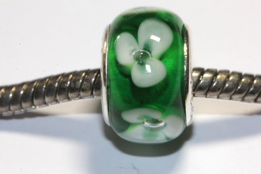 Modulperle in Tannengrün und Mint mit "schwimmenden" Blüten. Alle unsere Modulperlen sind mit Sterlingsilberhülsen ausgestattet. Der Außendurchmesser ist ca. 14 mm. Der Lochdurchmesser beträgt immer 5 mm. Passend für alle gängigen Ketten und Armbänder bekannter Markenhersteller. Alle Glasperlen werden am Zweigas-Brenner aus Morettiglas (Muranoglas) handgefertigt. Die Perlen werden im digital gesteuerten Ofen spannungsfrei getempert. Für lange Lebensdauer robuste Qualität. Jedes Teil ist ein Unikat.