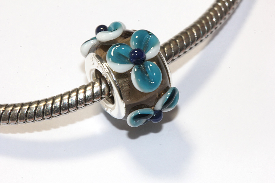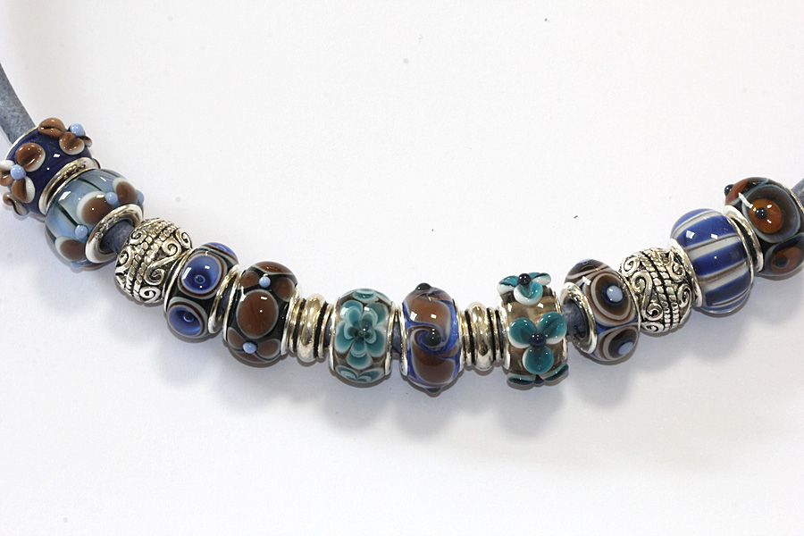 Modulperle in unterschiedlichen Blautönen und Braun. Alle unsere Modulperlen sind mit Sterlingsilberhülsen ausgestattet. Der Außendurchmesser ist ca. 14 mm. Der Lochdurchmesser beträgt immer 5 mm. Passend für alle gängigen Ketten und Armbänder bekannter Markenhersteller. Alle Glasperlen werden am Zweigas-Brenner aus Morettiglas (Muranoglas) handgefertigt. Die Perlen werden im digital gesteuerten Ofen spannungsfrei getempert. Für lange Lebensdauer robuste Qualität. Jedes Teil ist ein Unikat.