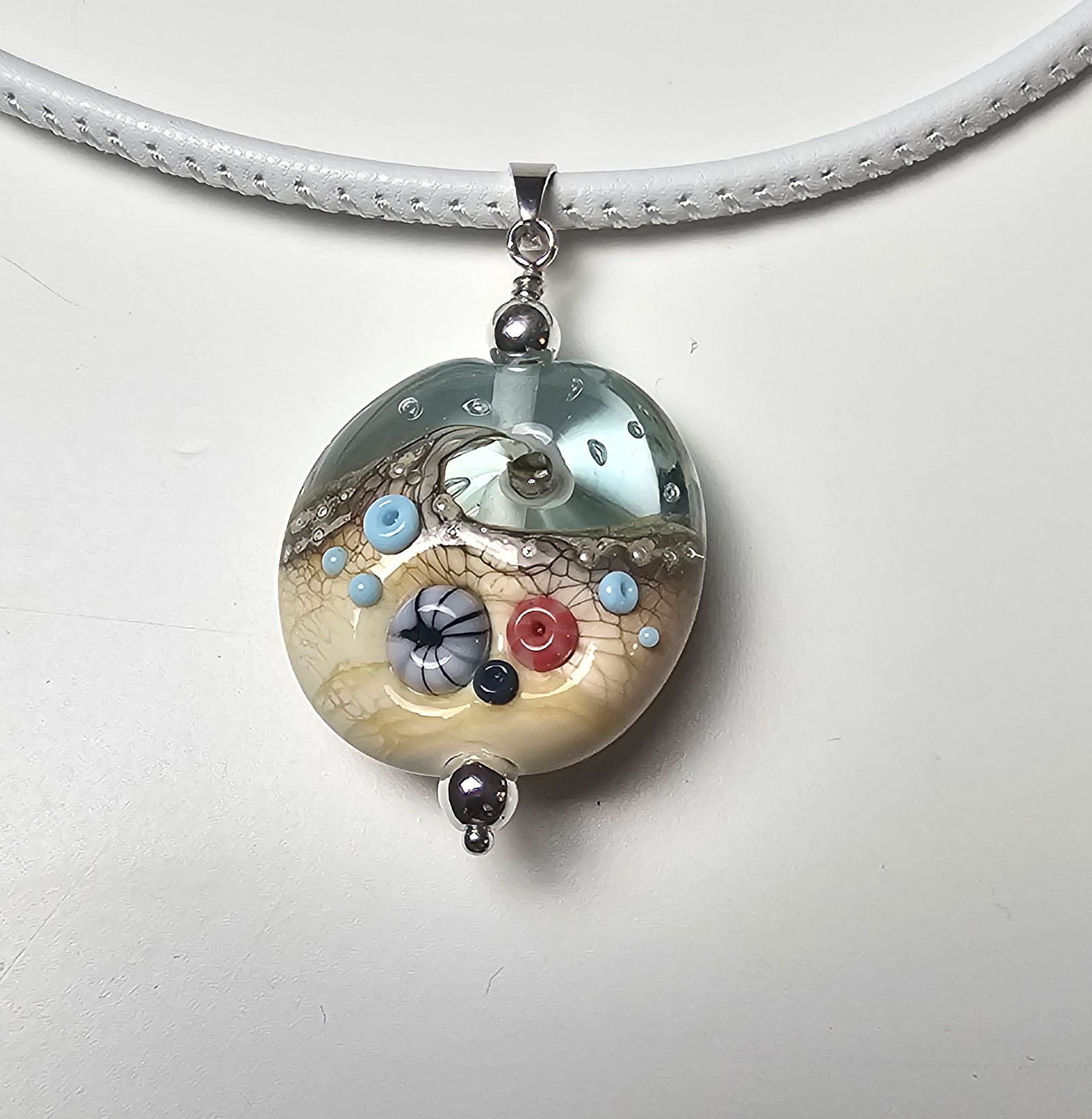 Außergewöhnlicher Anhänger mit aufwändig gefertigter Künstlerperle aus Muranoglas in Linsenform, Durchmesser ca. 24 x 12 mm. Gesamtlänge des Anhängers ca. 40 mm. Aufhängeöse für Ketten bis 3 mm, Nietstift mit Kugel silberfarben.