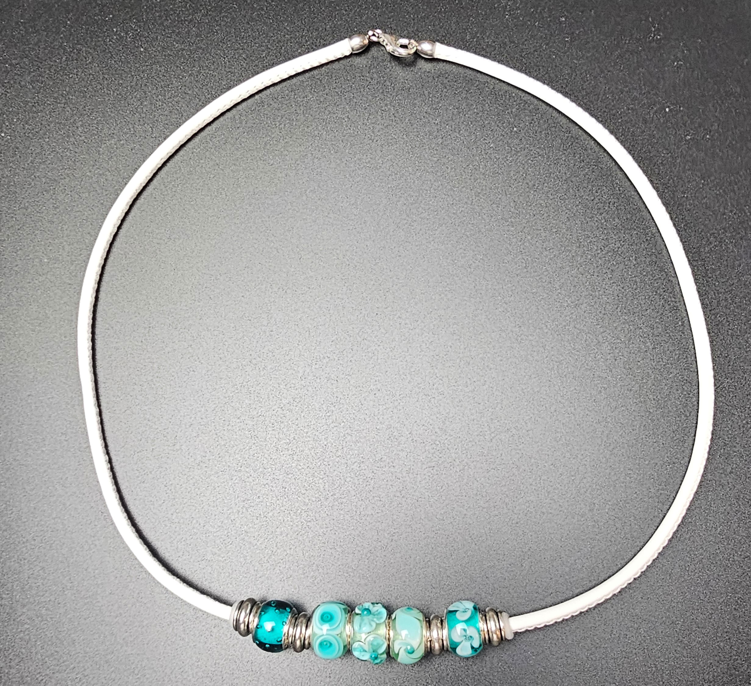 Modulperlen mit maximal 14 mm Duchmesser und Sterlingsilberhülsen. Akzentfarbe Meergrün mit Malachitgrün aus Muranoglas.