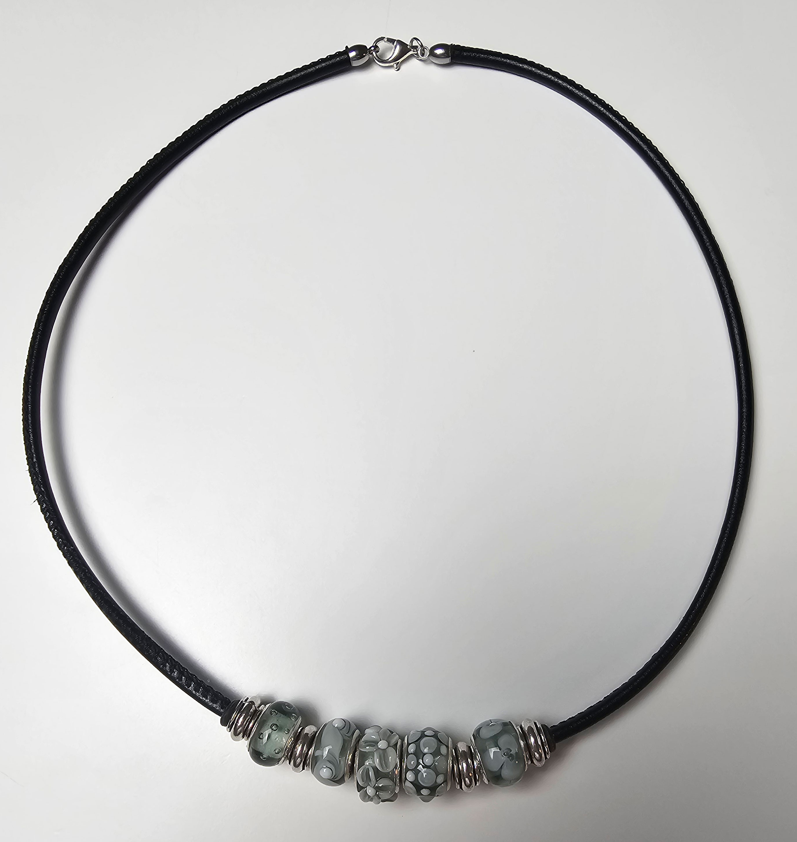 Modulperlen mit maximal 14 mm Duchmesser und Sterlingsilberhülsen. Akzentfarbe Silbergrau mit Weiß aus Muranoglas.