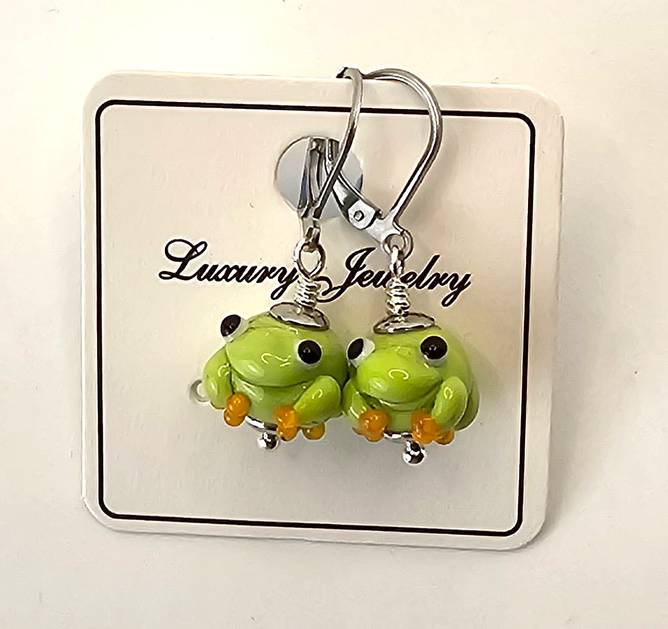 Ohrhänger Fröschlein aus Muranoglas. Klapp-Brisur aus Chirurgenstahl. Gesamtlänge ca. 33 mm.