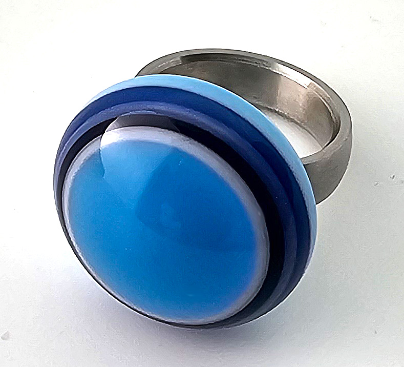 Dominanter Wechselring-Top (Ringaufsatz) aus Muranoglas mit konzentrischen Kreisen. Akzentfarben Aqua und Lavendel. Durchmesser ca. 21 mm, 8 mm hoch. Das Glas wurde direkt auf eine spezielle Edelstahl-Mutter gewickelt. Glas und Mutter sind untrennbar miteinander verbunden. Das Top wird einfach auf den Gewindezapfen des Grundringes (auch hier im Shop erhältlich) aufgeschraubt.