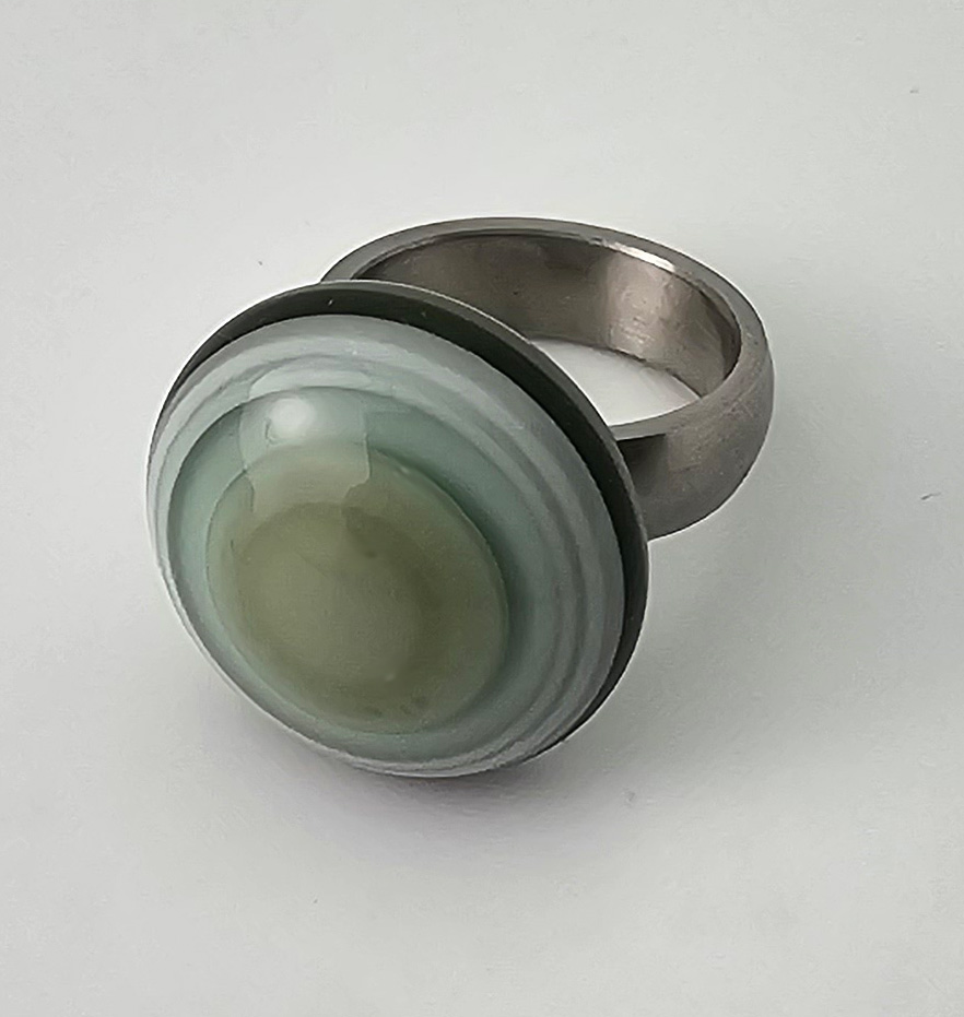Wechselring-Top (Ringaufsatz) mit Akzentfarbe Mintgrün. Durchmesser 20 mm, 8 mm hoch. Das Glas wurde direkt auf eine spezielle Edelstahl-Mutter geschmolzen. Glas und Mutter sind untrennbar miteinander verbunden. Das Top wird einfach auf den Gewindezapfen des Grundringes (GU00556 auch hier im Shop erhältlich) aufgeschraubt.