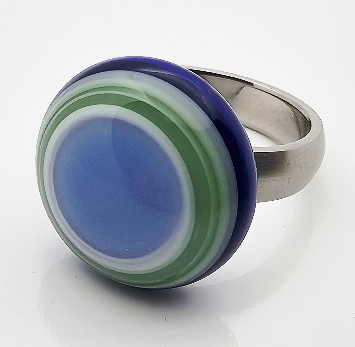 Dominanter Wechselring-Top (Ringaufsatz) aus Muranoglas mit konzentrischen Kreisen. Akzentfarben Saphirblau und Mint. Durchmesser ca. 19 mm, 8 mm hoch. Das Glas wurde direkt auf eine spezielle Edelstahl-Mutter gewickelt. Glas und Mutter sind untrennbar miteinander verbunden. Das Top wird einfach auf den Gewindezapfen des Grundringes (auch hier im Shop erhältlich) aufgeschraubt.