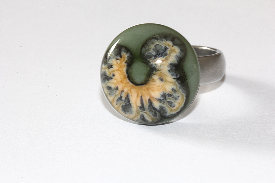 Wechselring-Top (Ringaufsatz) aus Muranoglas mit Fantasiemuster Elfenbein auf schilfgrünem Grund. Durchmesser 18 mm, 8 mm hoch. Das Glas wurde direkt auf eine spezielle Edelstahl-Mutter gewickelt. Glas und Mutter sind untrennbar miteinander verbunden. Das Top wird einfach auf den Gewindezapfen des Grundringes (auch hier im Shop erhältlich) aufgeschraubt.