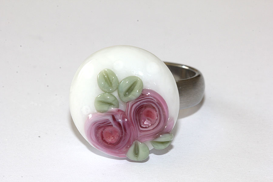 Beeindruckender Wechselring-Top (Ringaufsatz) aus Muranoglas. In Akzentfarbe Weiß. Auf einer weißen Grundperle wurde Klarglas aufgeschmolzen in dem lavendelfarbene Blüten "schwimmen". Opake weiße Tupfen auf der Oberfläche.
