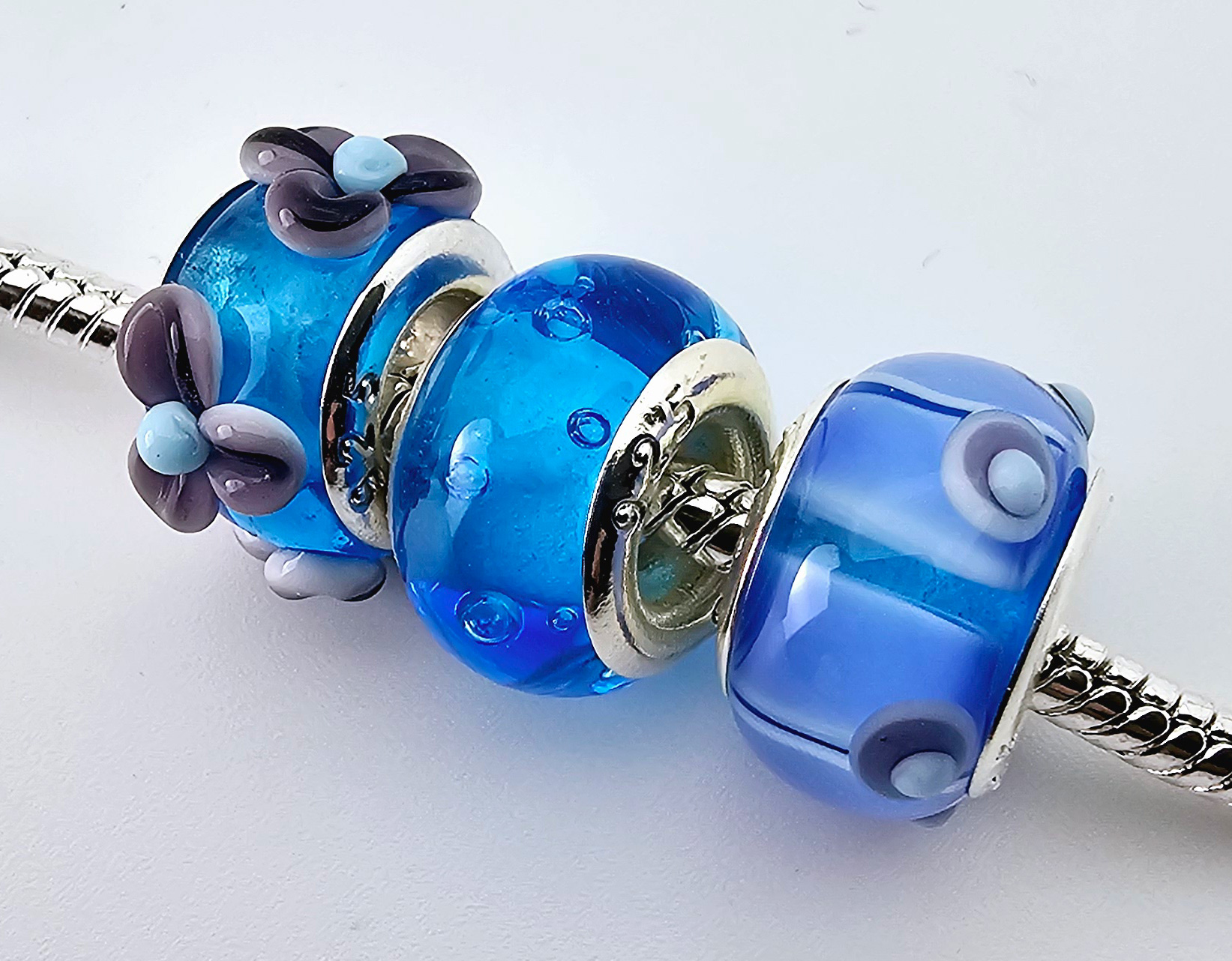 Modulperlen mit max. 14 mm Außendurchmesser im 3er Set aus Muranoglas mit Akzentfarben Aquablau und Lavendel, mit Sterlingsilberhülse, 5mm-Lochdurchmesser, passend für alle gängigen Ketten und Armbänder bekannter Markenhersteller.