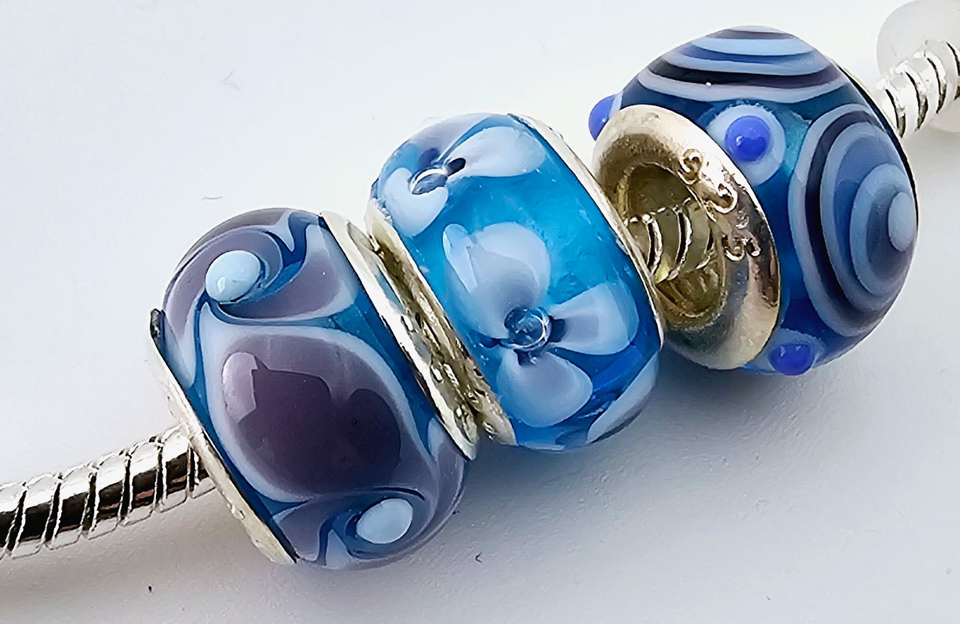 Modulperlen mit max. 14 mm Außendurchmesser im 3er Set aus Muranoglas mit Akzentfarben Aquablau und Lavendel, mit Sterlingsilberhülse, 5mm-Lochdurchmesser, passend für alle gängigen Ketten und Armbänder bekannter Markenhersteller.