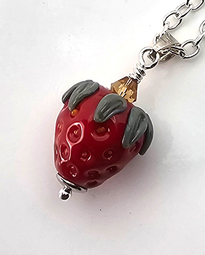 Naturgetreu modellierte Erdbeere mit ca. 13 mm Durchmesser für Ihe Kette bis 3 mm mit funkelndem Swarowski-Kristall.