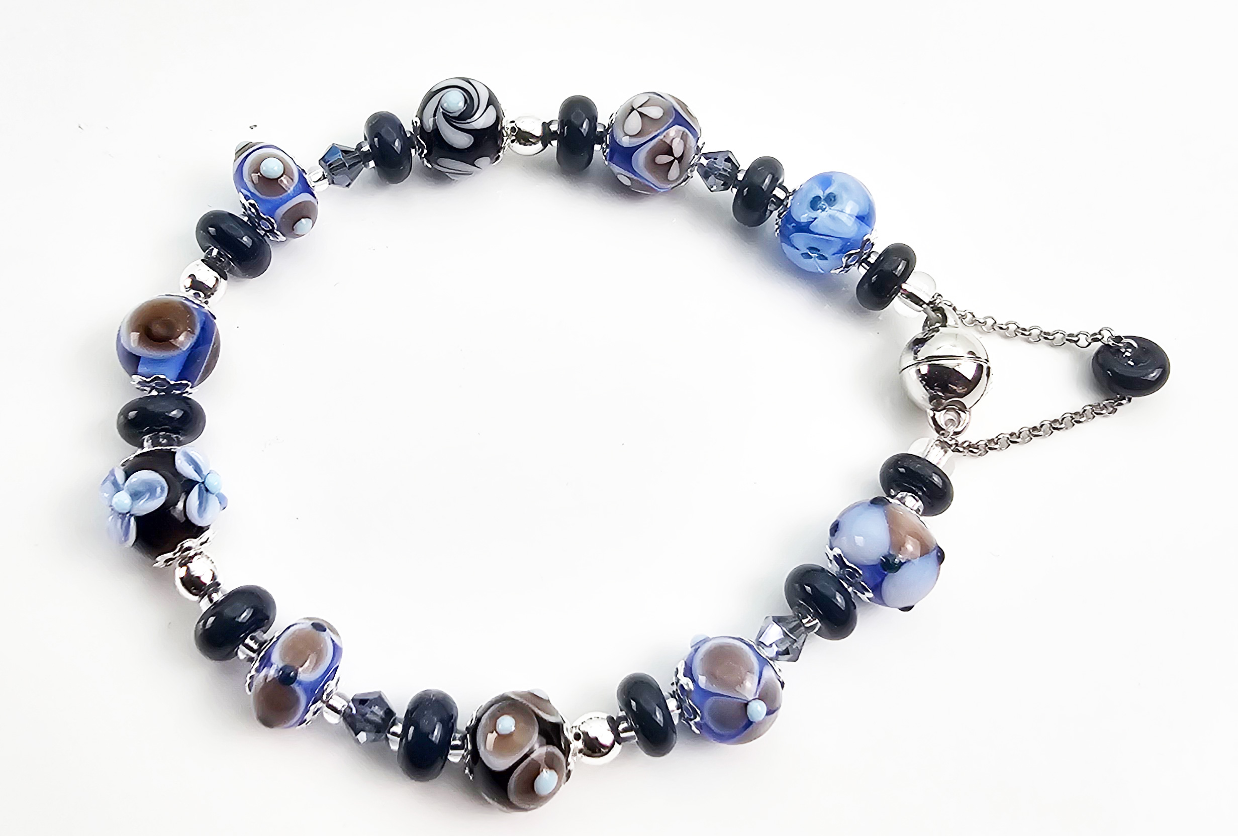 Aufwändig gearbeitetes Armband. Alle Perlen sind aus Muranoglas handgewickelt. Jede einzelne Perle für sich ist ein kleines Kunstwerk. Die Perlen sind für eine lange Lebensdauer durch einen programmierten Abkühlprozess in unserem Spezial-Perlenofen spannungsfrei getempert.