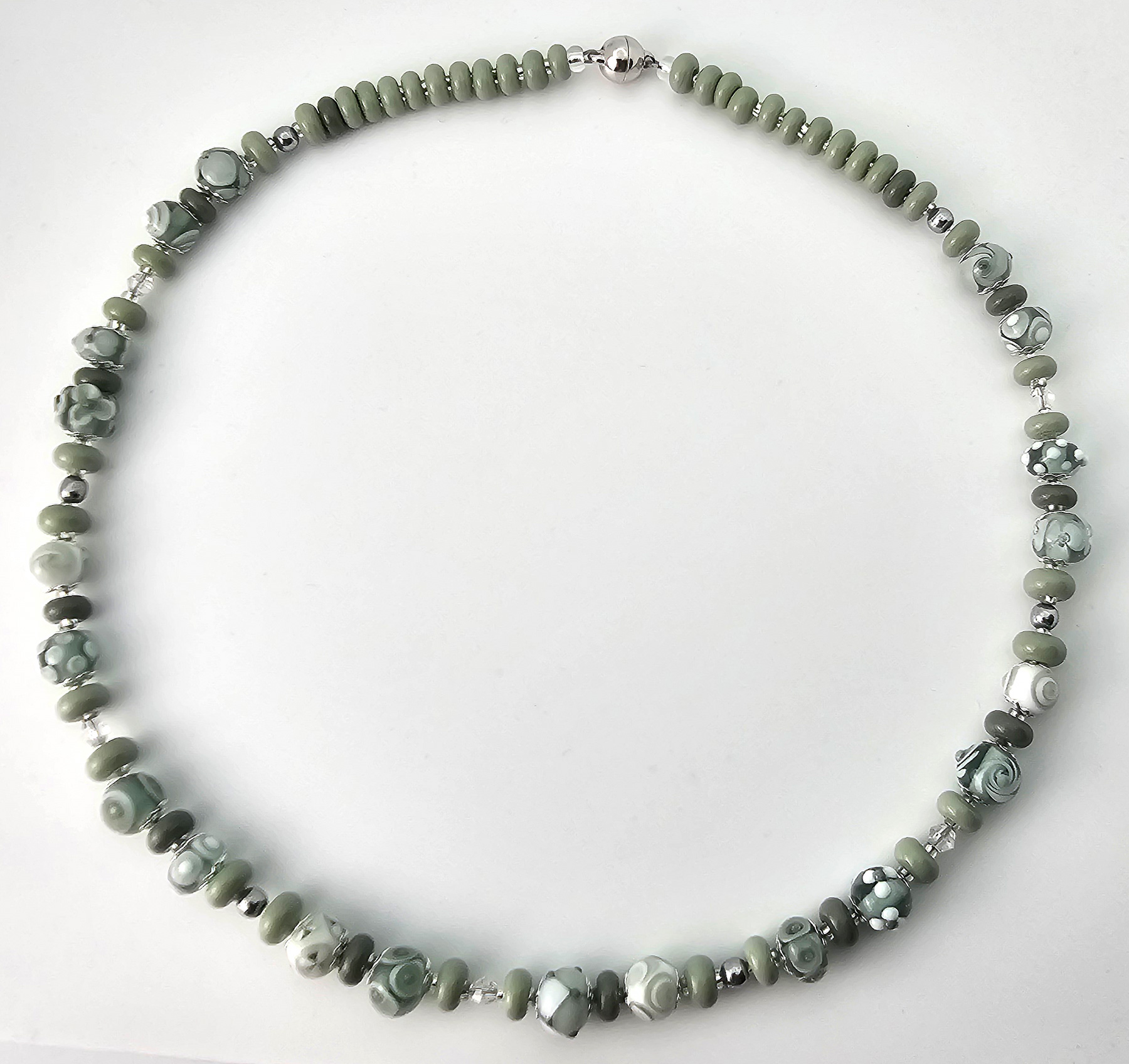 Collier Sinfonie in Schilfgrün, 50 cm, Handgewickelte Muranoglasperlen mit 8 - 10 mm Durchmesser. Desweiteren habe ich farblich passende Swarowski-Kristalle, rhodinierte Perlkappen und Silbereinzugsperlen als Zwischenglieder verarbeitet.