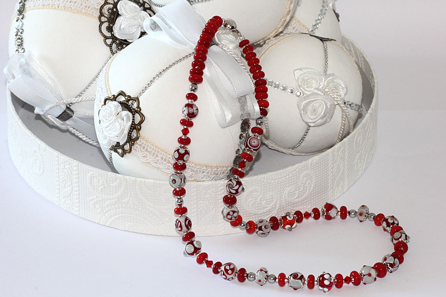 Handgewickelte Muranoglasperlen mit 8 - 10 mm Durchmesser. Desweiteren habe ich farblich passende Swarowski-Kristalle, rhodinierte Perlkappen und Silbereinzugsperlen als Zwischenglieder verarbeitet.