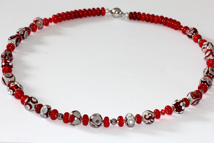 Handgewickelte Muranoglasperlen mit 8 - 10 mm Durchmesser. Desweiteren habe ich farblich passende Swarowski-Kristalle, Perlkappen und Silbereinzugsperlen als Zwischenglieder verarbeitet.