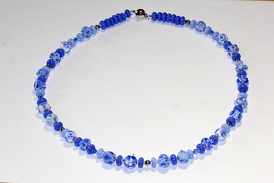 Collier Saphirblaue Vielfalt, 50 cm, Handgewickelte Muranoglasperlen mit 8 - 10 mm Durchmesser. Desweiteren habe ich farblich passende Swarowski-Kristalle, rhodinierte Perlkappen und Silbereinzugsperlen als Zwischenglieder verarbeitet.