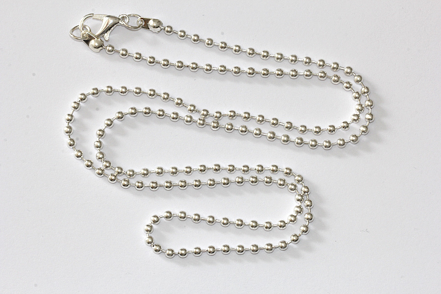 Zarte Kette mit Kugelgliedern, 2,2 mm. Karabinerverschluss und Kette sind versilbert.