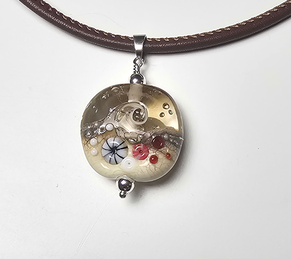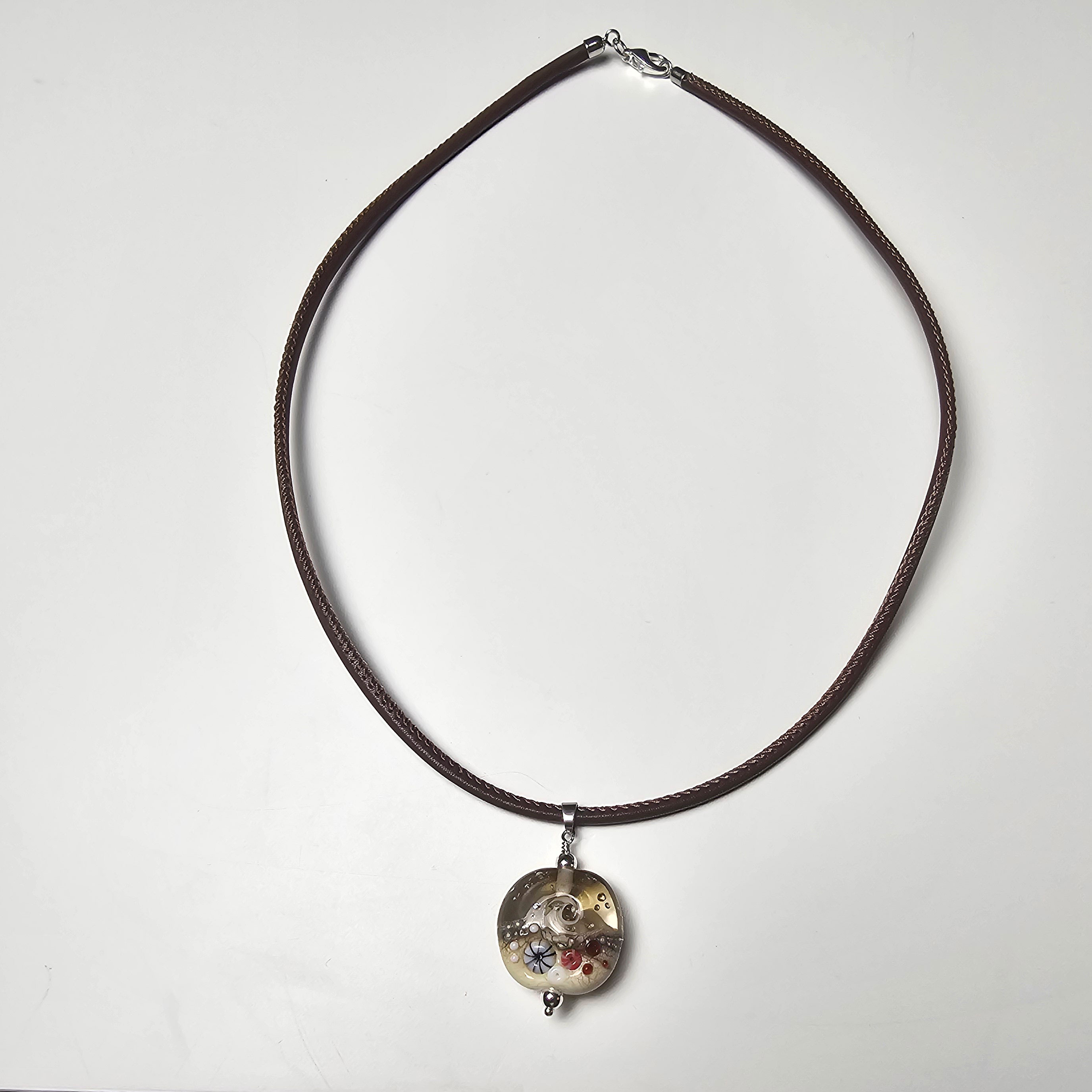 Außergewöhnlicher Anhänger mit aufwändig gefertigter Künstlerperle aus Muranoglas in Linsenform, Durchmesser ca. 24 x 12 mm. Gesamtlänge des Anhängers ca. 40 mm. Aufhängeöse für Ketten bis 3 mm, Nietstift mit Kugel silberfarben.