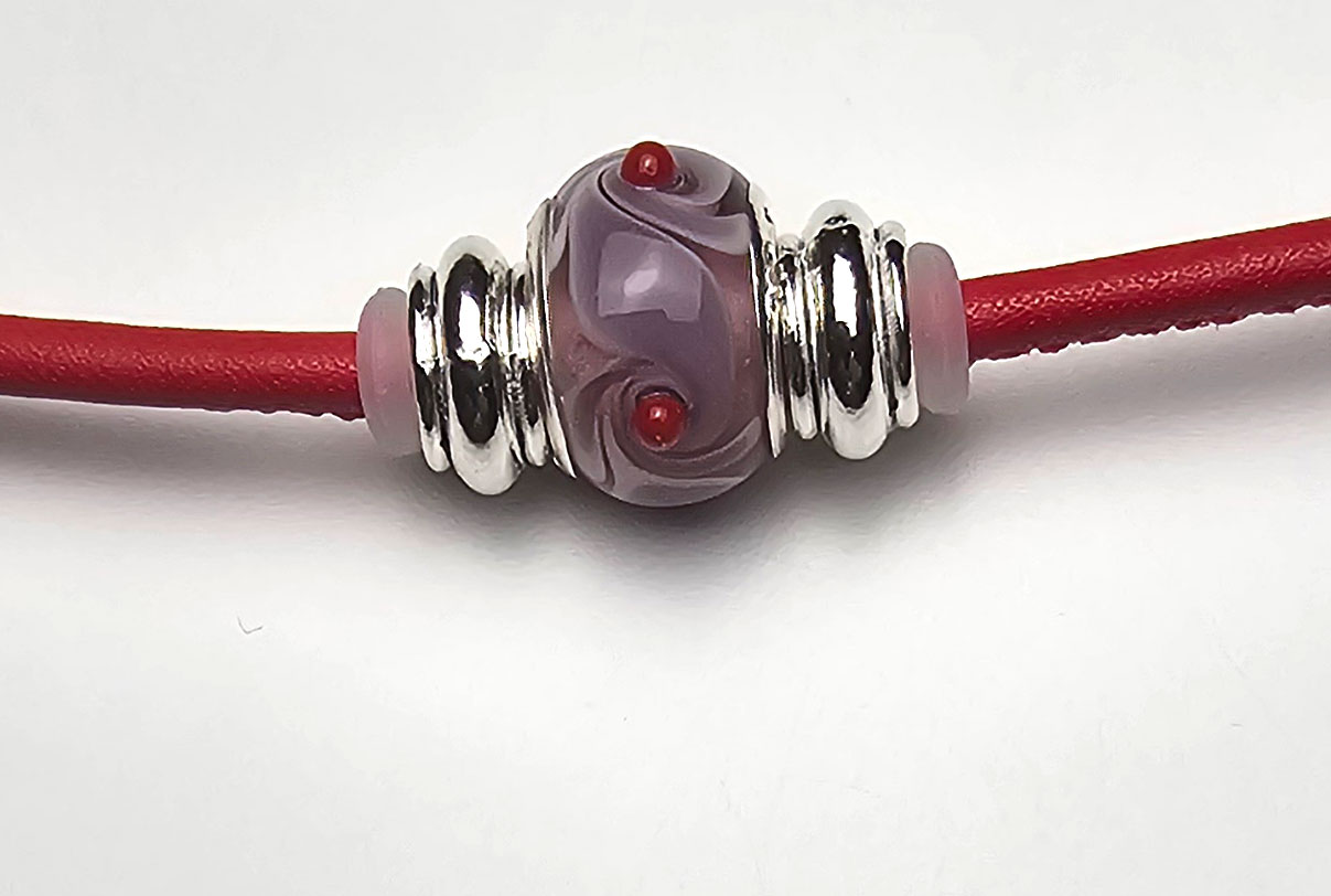 Nappaledercollier, rund gesäumt, 3 mm Bandstärke, rot und versilberter Karabinerverschluss. Modulperle rotviolett aus Muranoglas, 14-mm-Perle mit zwei versilberten Ergänzungsperlen und Silikonstopper.
