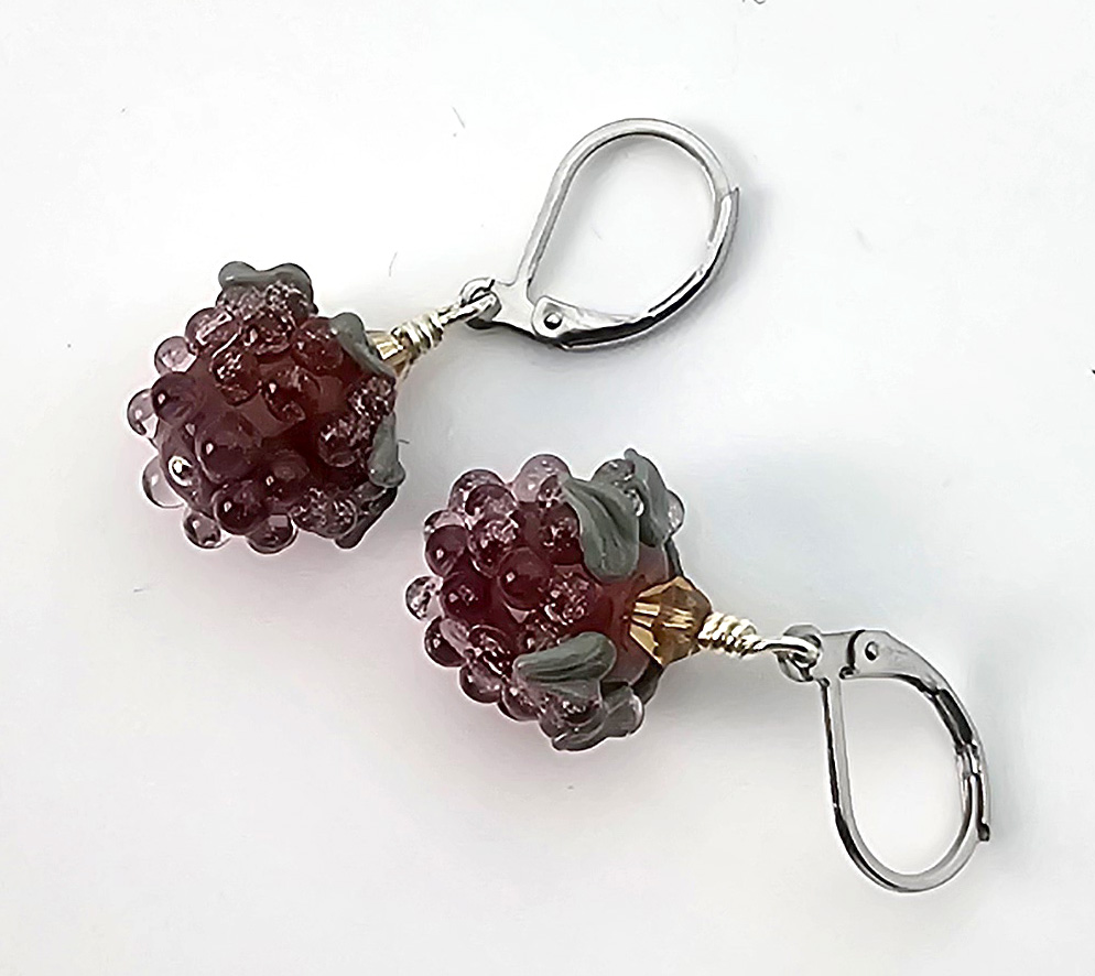 Ohrhänger Himbeere aus Muranoglas und Swarowski-Kristallen. Klapp-Brisur aus Chirurgenstahl. Gesamtlänge ca. 35 mm.
