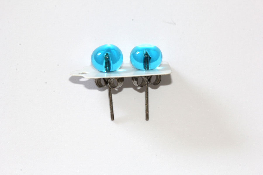 Ohrstecker, transparent dunkles Aquamarin, mit handgewickelter Perle, Durchmesser ca. 7 mm, aus Muranoglas.