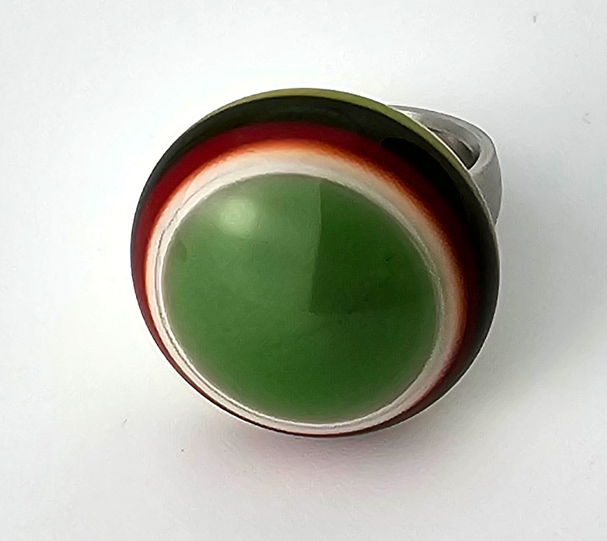 Auffälliger Wechselring-Top (Ringaufsatz) mit konzentrischen Kreisen. Durchmesser 22 mm, 8 mm hoch. Das Glas wurde direkt auf eine spezielle Edelstahl-Mutter gewickelt. Glas und Mutter sind untrennbar miteinander verbunden.