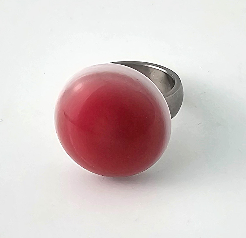 Wechselring-Top (Ringaufsatz) aus Muranoglas. Akzentfarbe Mystic Pink. Durchmesser 20 mm, 8 mm hoch. Das Glas wurde direkt auf eine spezielle Edelstahl-Mutter gewickelt. Glas und Mutter sind untrennbar miteinander verbunden. Das Top wird einfach auf den Gewindezapfen des Grundringes (auch hier im Shop erhältlich) aufgeschraubt.
