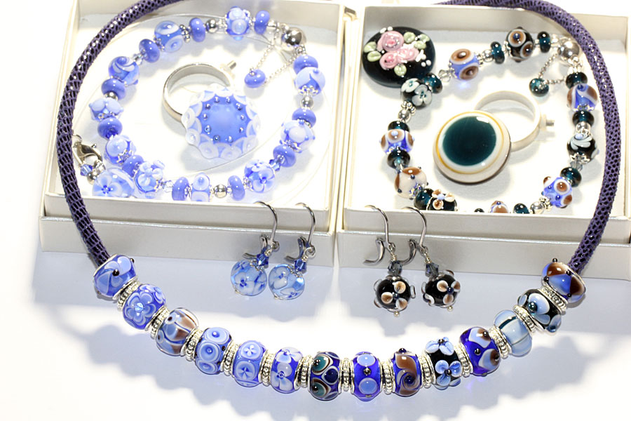Alle Glasperlen werden am Zweigas-Brenner aus Morettiglas (Muranoglas). Die Perlen werden im digital gesteuerten Ofen spannungsfrei getempert. Sie sind somit robust wie die Murmeln aus Kindertagen. Jedes Teil ist ein Unikat.