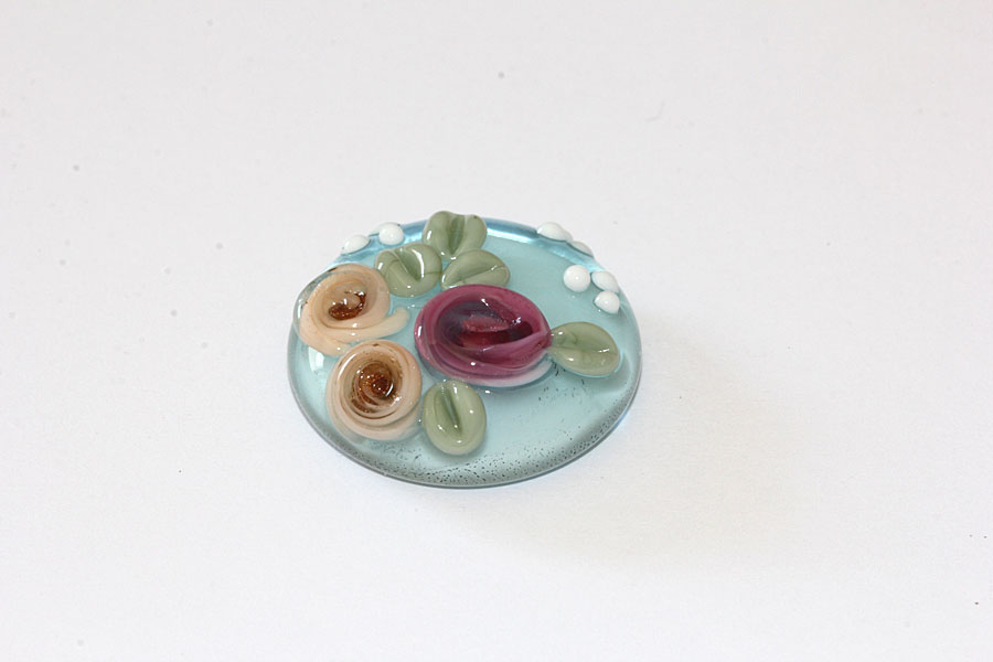 Romantischer Wechselring-Top (Ringaufsatz) mit frostblauer Basis und aufgesetzten Röschen. Blätter mintgrün. Durchmesser 24 mm, 8 mm hoch. Das Glas wurde direkt auf eine spezielle Edelstahl-Mutter geschmolzen. Glas und Mutter sind untrennbar miteinander verbunden. Das Top wird einfach auf den Gewindezapfen des Grundringes (auch hier im Shop erhältlich) aufgeschraubt.