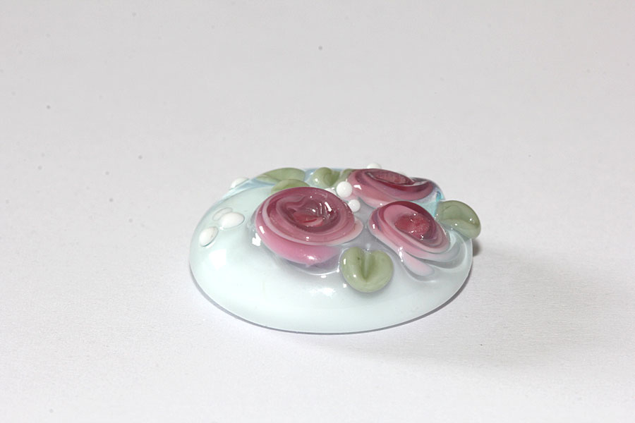 Romantischer Wechselring-Top (Ringaufsatz) mit aquablauer Basis und aufgesetzten Röschen. Blätter mintgrün. Durchmesser 23 mm, 8 mm hoch. Das Glas wurde direkt auf eine spezielle Edelstahl-Mutter geschmolzen. Glas und Mutter sind untrennbar miteinander verbunden. Das Top wird einfach auf den Gewindezapfen des Grundringes (auch hier im Shop erhältlich) aufgeschraubt.