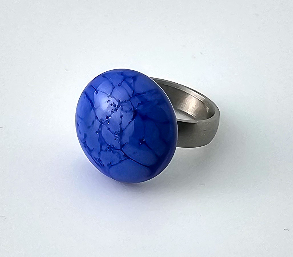 Ring-Top in hellem Lapisfarbton, Ringaufsatz aus Muranoglas mit Fantasiemuster. Durchmesser 19 mm.