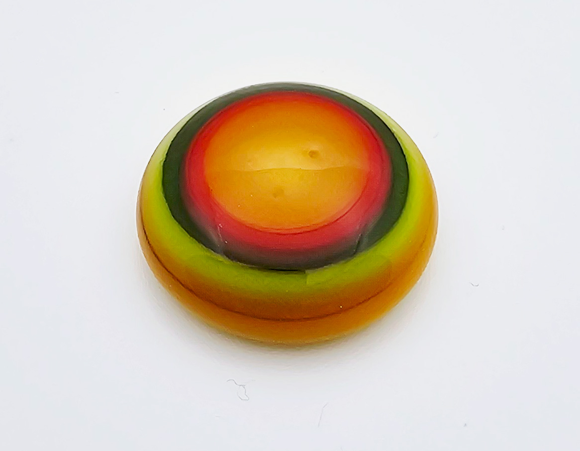 Dominanter Wechselring-Top (Ringaufsatz) aus Muranoglas mit konzentrischen Kreisen. Akzentfarben Mango, Grün und Gelbtöne. Durchmesser ca. 22 mm, 8 mm hoch.