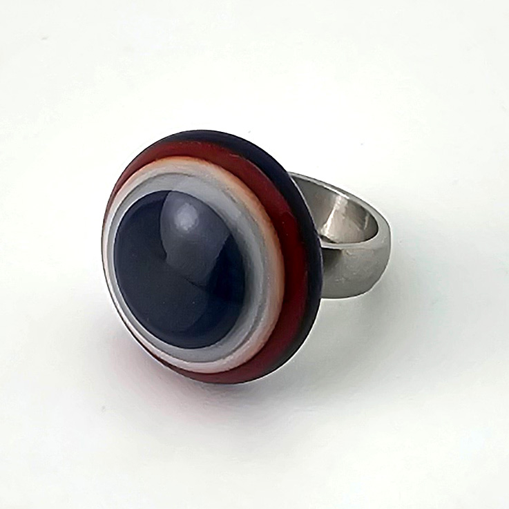 (Ringaufsatz) aus Muranoglas mit konzentrischen Kreisen. Akzentfarben Preußischblau und Rot. Durchmesser ca. 23 mm, 8 mm hoch. Das Glas wurde direkt auf eine spezielle Edelstahl-Mutter gewickelt. Glas und Mutter sind untrennbar miteinander verbunden. Das Top wird einfach auf den Gewindezapfen des Grundringes (auch hier im Shop erhältlich) aufgeschraubt.