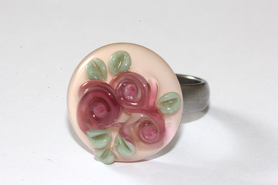 Romantischer Wechselring-Top (Ringaufsatz) mit pfirsichfarbener Basis und aufgesetzten Röschen. Blätter mintgrün. Durchmesser 21 mm, 9 mm hoch. Das Glas wurde direkt auf eine spezielle Edelstahl-Mutter geschmolzen. Glas und Mutter sind untrennbar miteinander verbunden. Das Top wird einfach auf den Gewindezapfen des Grundringes (auch hier im Shop erhältlich) aufgeschraubt.